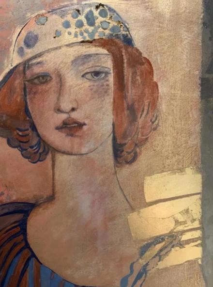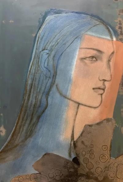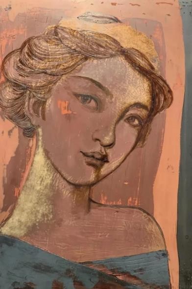 她的绘画不再妥协于庸常的写实造形,画中女性充满诗意与灵性,体现出东方性与当代性的自洽。她以诗人般的情怀融解画笔下的造型,向你娓娓诉说现代女性自我存在状态的内在意识,并将日常的感性置入浪漫,安谧闲适。很容易让人记住那些稍带忧郁和不屑的眼神,清澈却也迷离。