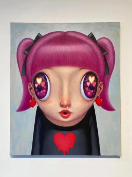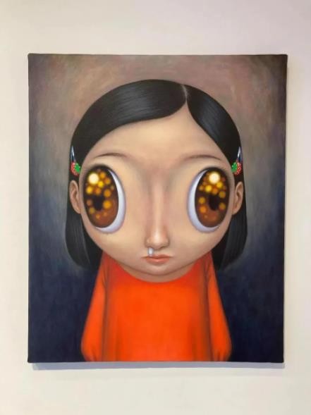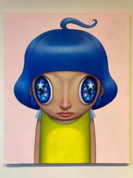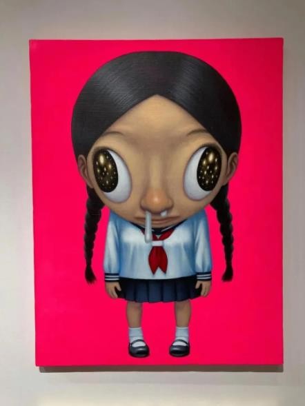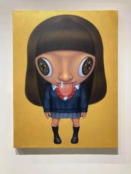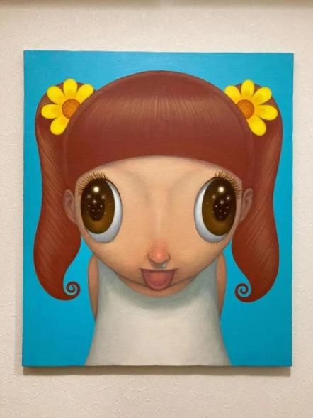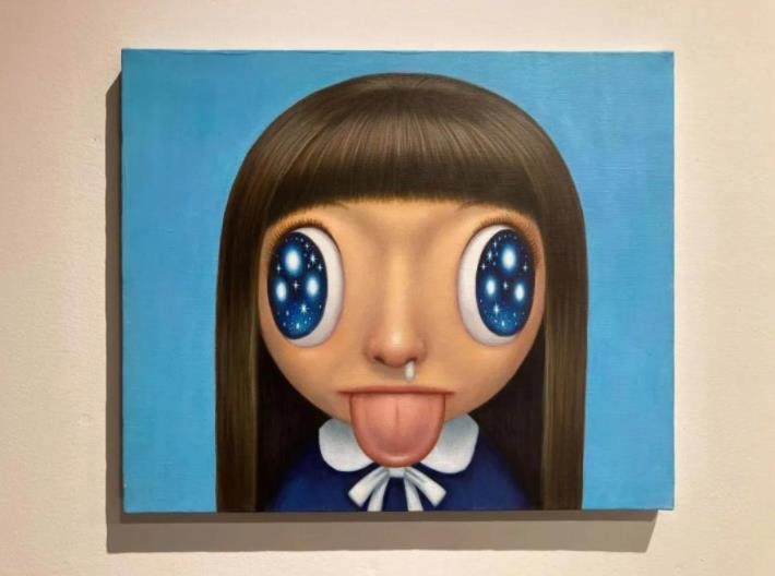 用“天星”词汇来提炼山口直久的绘画样貌,着实富有一股若即若离的虚实关系……但在这里,“天星”的语义则是我们在孩童时期面对夜色落幕前抬头仰望星辰的那种好奇和惊讶,以及在此期间星星位移闪烁并展现出的转瞬即逝的时间变化。他笔下不同发型的女孩形象,被夸张放大的彩色眼眸,势欲挣脱平面中的画布尺寸。其中细微的局部表现,便是由鼻孔流出的鼻涕之物,而这正是孩童天真烂漫的真实写照,可爱无邪。