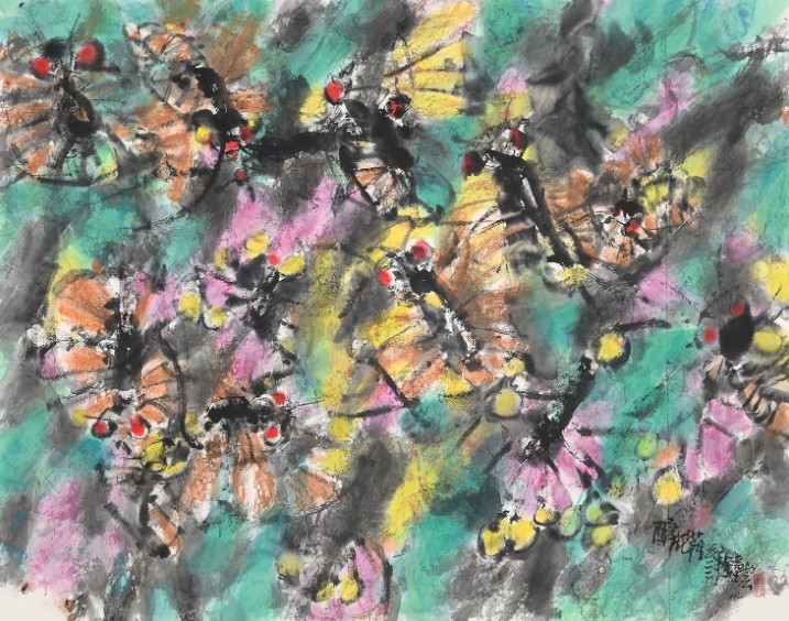 正如王鲁湘先生《说说冯钟云的画》一文中所述: “他的画半抽象半具象,远看觉得画了个这画了个那,近观又看不出是个啥,鸟非鸟,花非花,石非石,但好看,墨韵苍郁,色彩斑斓。画的人也一样,只是有个影,不辨雌雄,遑论五官与表情,但生动,生龙活虎的…… 冯钟云的画弱化了线条,强化了色彩,这使得他的水墨画看上去有很强的时代感和都市气息,我想这一定与他生活在澳门有关”。