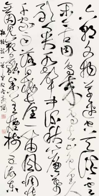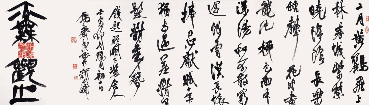 黄啸的这一批作品,主要取法怀素《自叙帖》等法帖,不失其恣肆放达的个性特点,气势恢宏,点画爽利,圆劲豪放,变幻诡奇,彰显其追求“乘兴而发”的书写状态。面对作品,我们可以鲜明感受到其创作时从自然中突发张力,不拘泥于前人创作形式, 仿佛要在行笔间寻找偶发灵感,蕴藏情感的整体状态。整体来看,他的字,与古为徒,师古化今。合时不流俗,求新而守古,写正大之气,写时代之神,尽显其文字修养,笔墨修养,其审美取向乃至人格品位,皆于书写中悄然流露。