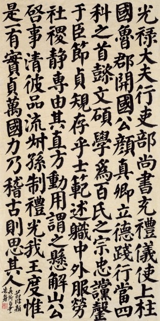 贾铎的作品,书体丰富,其楷书主要取法颜体,以篆籀之笔,化瘦硬为丰腴雄浑,结体宽博而气势恢宏,骨力遒劲而气概凛然,端庄雄伟,雍容大度。其章草通篇气息圆融浑然,参有汉简笔势,和谐统一;篆籀用笔,结字灵动飘逸,字字独立,圆润浑厚,有些字体略带隶意,章法茂密而能通透,因势生形,远观满目繁华,近看简约大方。其隶书表现出和谐端庄,古质典雅的气息,展现出浓厚的文人之气;结构安排上,隶书追求字形的平衡和和谐,每个字都经过精心布局,使得点画之间、部首与主体之间相互呼应、协调统一。这种结构安排使得隶书作品整体看起来美观大方,协调统一。纵观其书法风貌多变,用笔浑厚强劲,气势磅礴,情感充沛,具有很强的视觉冲击力和生命力。