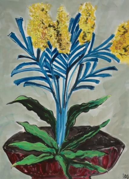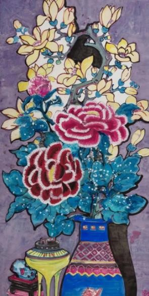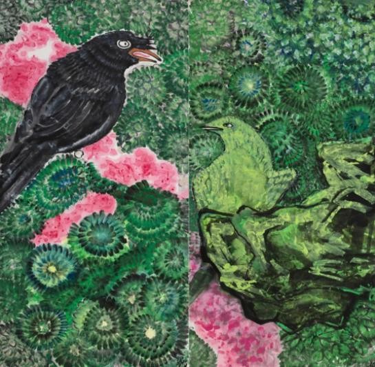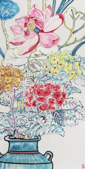 本次展览,梁缨将其笔下奇幻的大千世界图景集中在花卉这一领域,共计展出《花开富贵》、《岁朝清供》、《黄花蓝叶》、《连莲看》、《绿与黑》、《芙蓉园里看花,鱼藻池边射鸭》、《鱼自乐》等三十余幅作品。