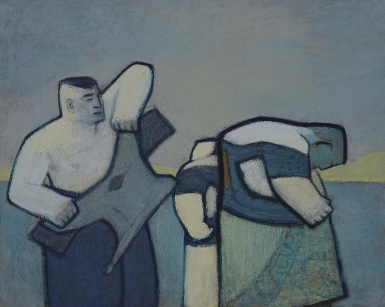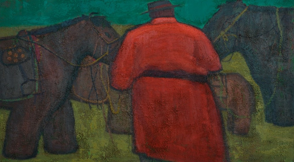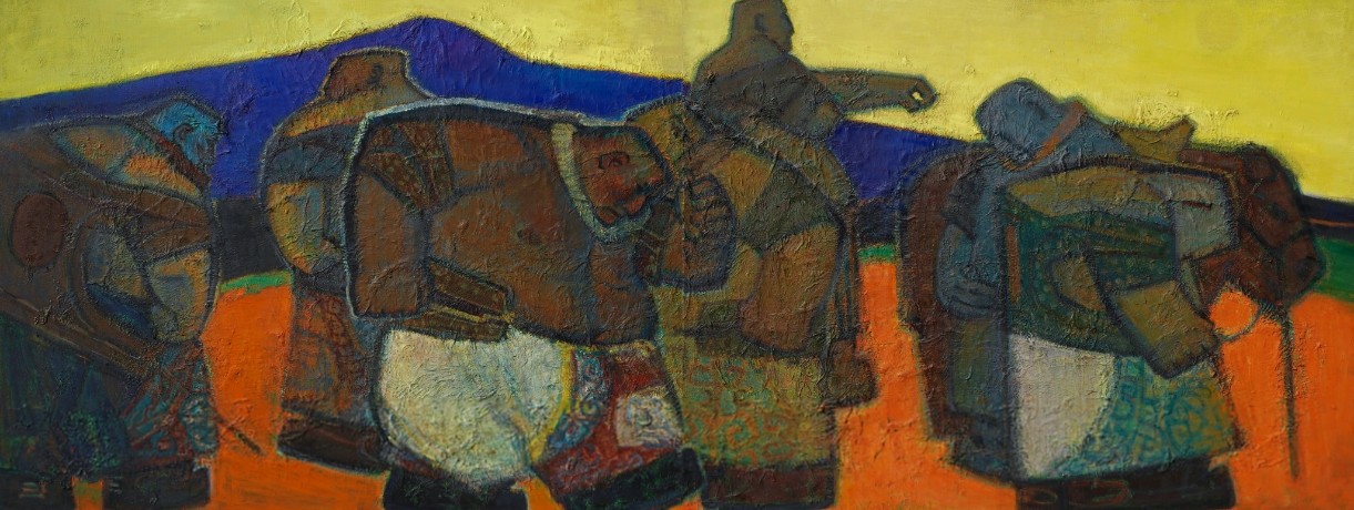 以独特的目光捕捉蒙古族文化的“微缩宇宙”——从草原的辽阔到毡房的烟火气,从牧民的日常劳作到那达慕的热烈庆典,通过油画语言解构传统符号,赋予其当代审美意涵,将蒙古族文化置于“他者凝视”与“自我言说”的对话中。