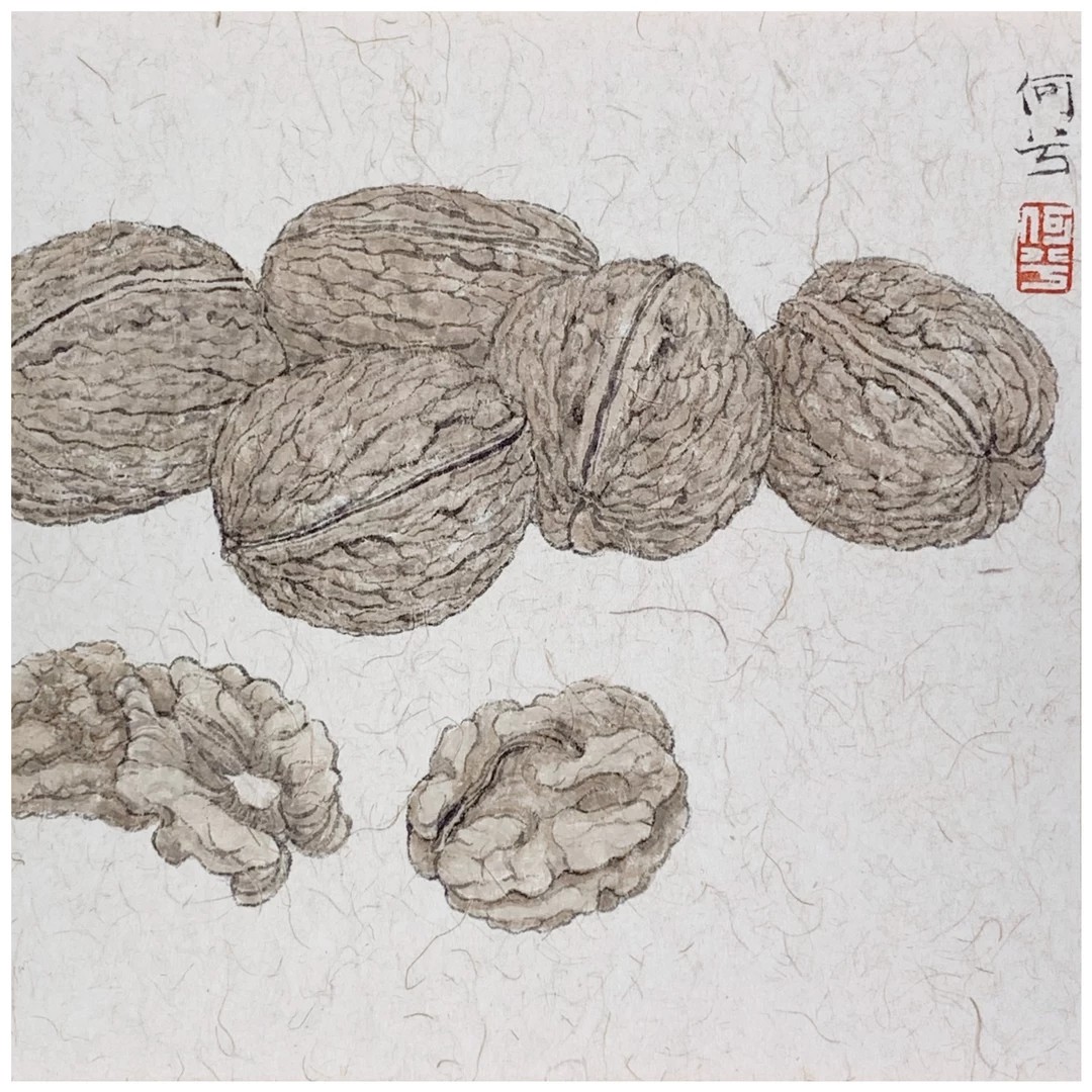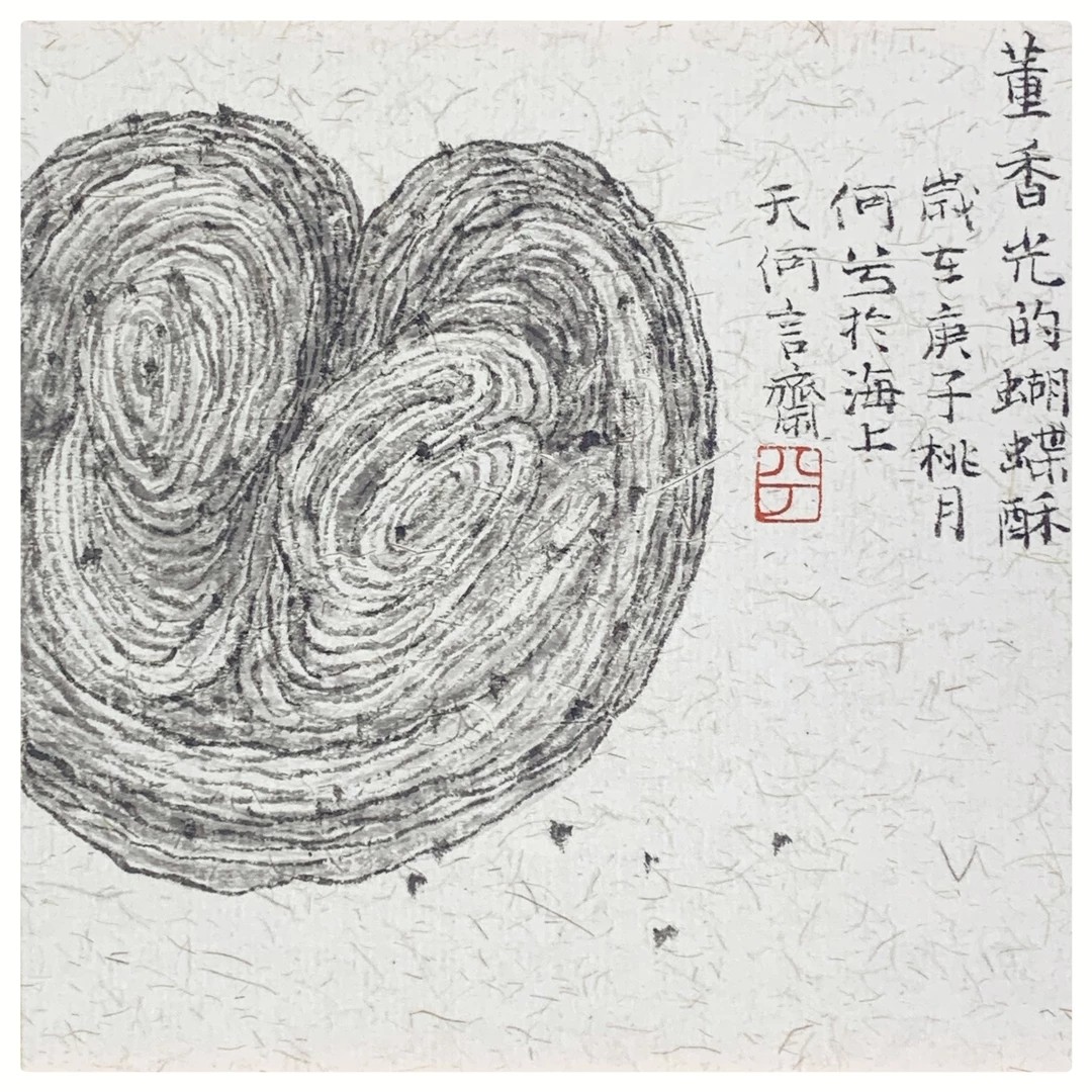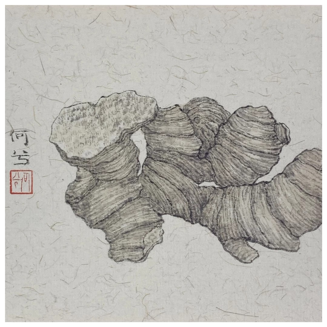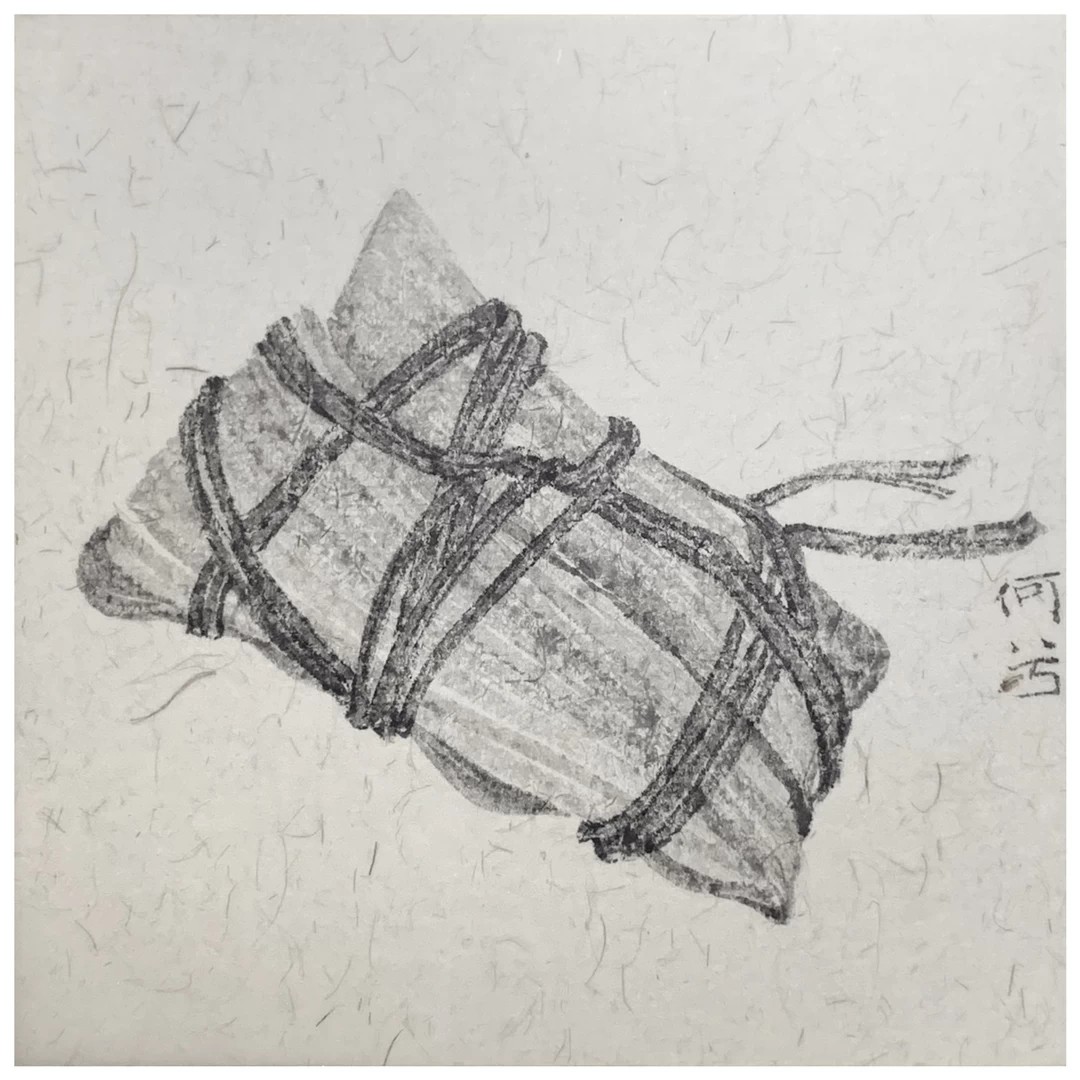 何曦说,一天不画画就会心慌,他像写日记一般自得其乐地画着每一张作品。摩羯座的他觉得自己创作时有点像车间工人,站在作画的整面白墙前,数小时不停地劳作,会对每一张画死磕。他不喜欢三矾九染的方式,每一笔都是肯定写去,功力所至,干净爽利。虽然细节足够丰富,整体画面则有着一气呵成的潇洒和精致。何曦认为“迹有巧拙,艺无古今”,甚至在他的笔墨世界中,山水、人物、花鸟也没有严格的界限。他用梅花道人的笔法画美人粽,用石涛的荷叶皴画烧麦,用半千积墨法画海参,以长披麻绘大蒜,拖泥带水写松茸。天何言哉,万物生焉。宅居和坚守的日子,看得见最真的本色,听得见最轻的声音。夏已至,春未远,一切都将如约而来。