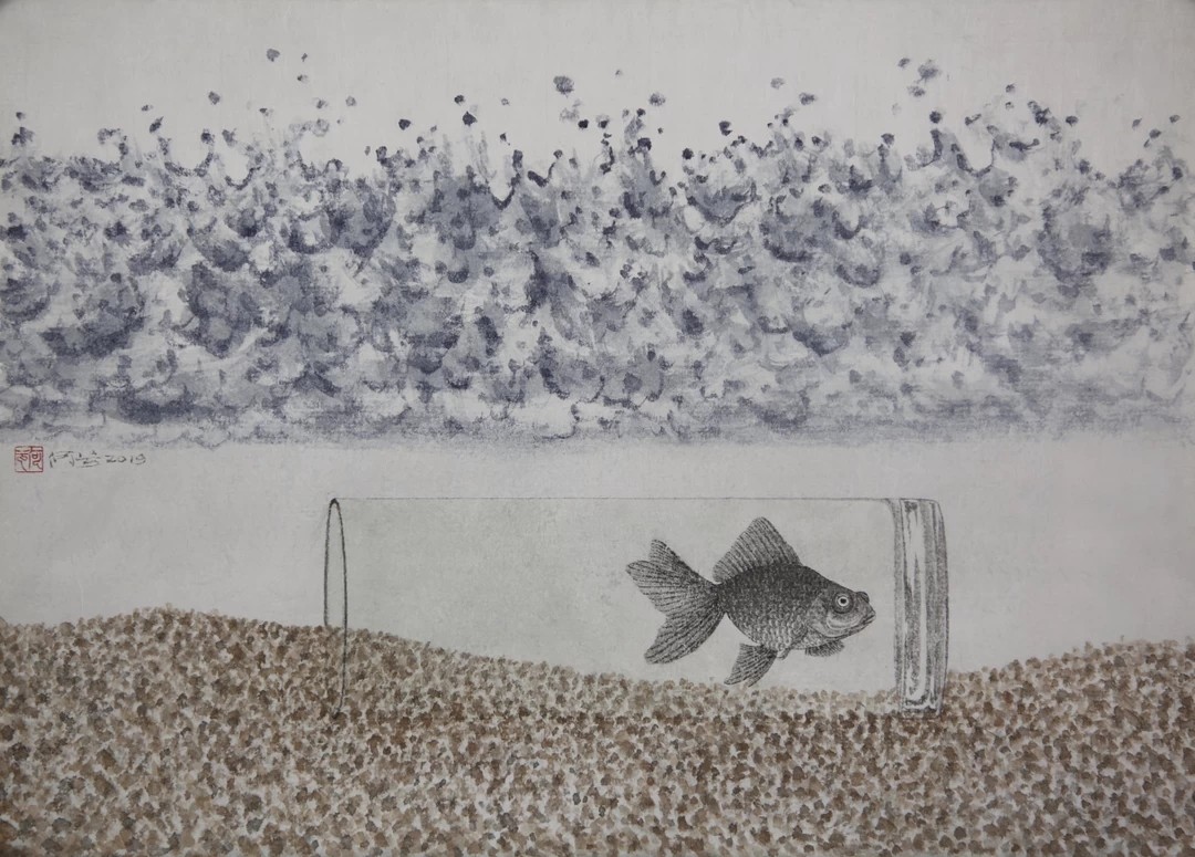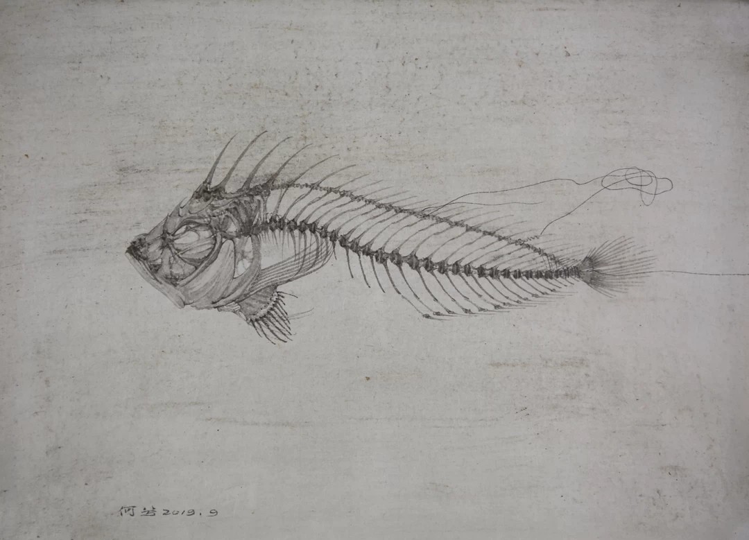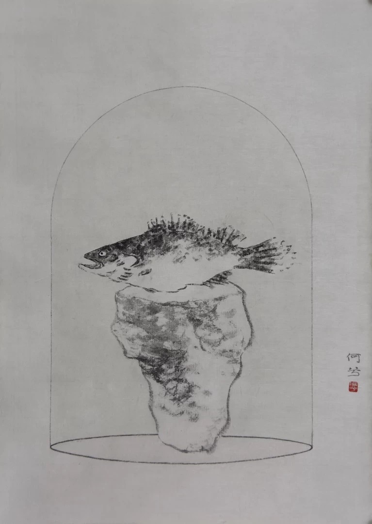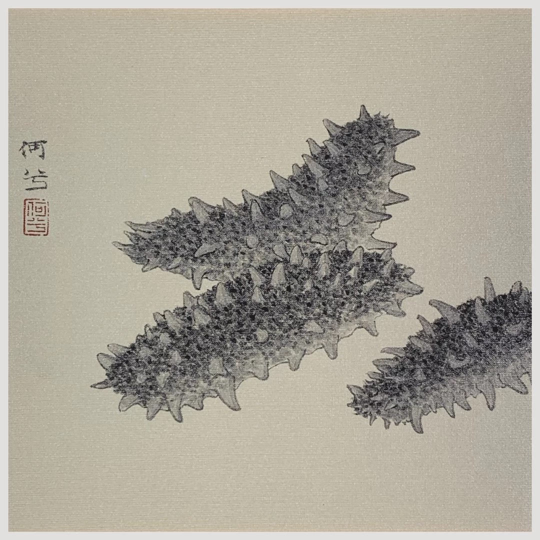 何曦说,一天不画画就会心慌,他像写日记一般自得其乐地画着每一张作品。摩羯座的他觉得自己创作时有点像车间工人,站在作画的整面白墙前,数小时不停地劳作,会对每一张画死磕。他不喜欢三矾九染的方式,每一笔都是肯定写去,功力所至,干净爽利。虽然细节足够丰富,整体画面则有着一气呵成的潇洒和精致。何曦认为“迹有巧拙,艺无古今”,甚至在他的笔墨世界中,山水、人物、花鸟也没有严格的界限。他用梅花道人的笔法画美人粽,用石涛的荷叶皴画烧麦,用半千积墨法画海参,以长披麻绘大蒜,拖泥带水写松茸。天何言哉,万物生焉。宅居和坚守的日子,看得见最真的本色,听得见最轻的声音。夏已至,春未远,一切都将如约而来。