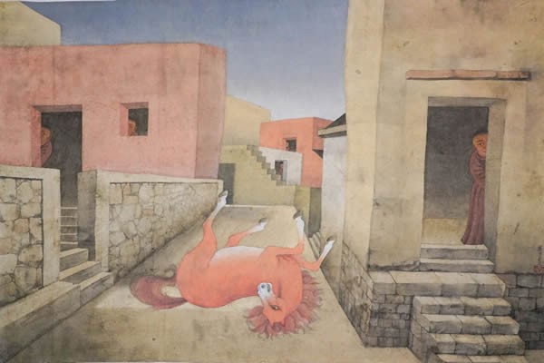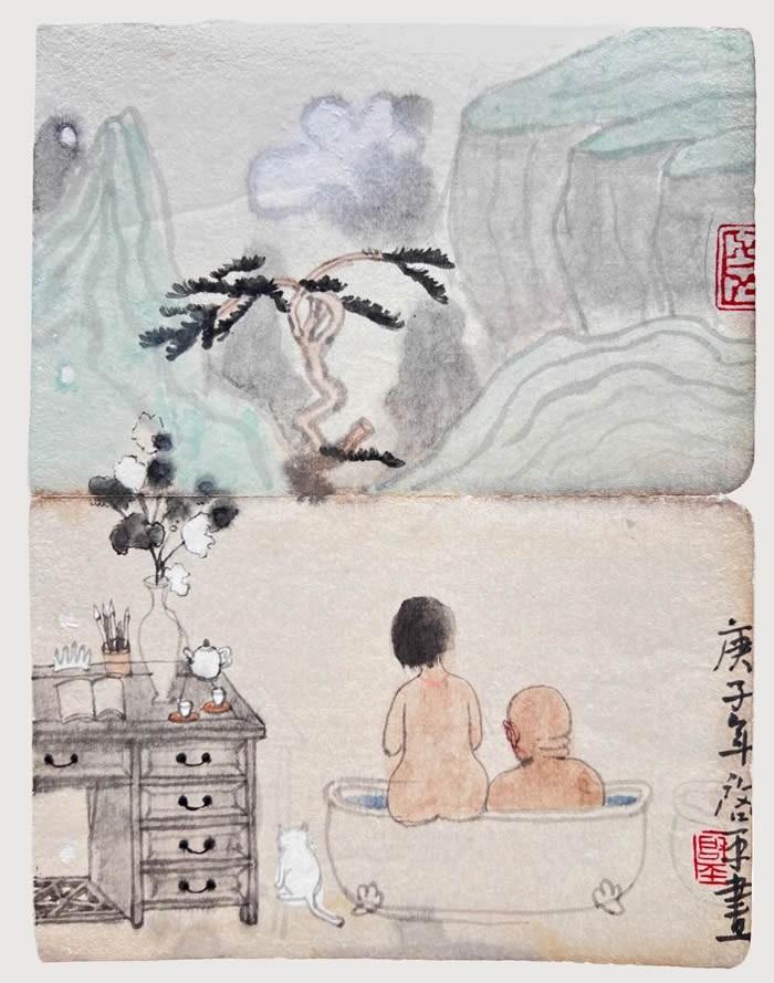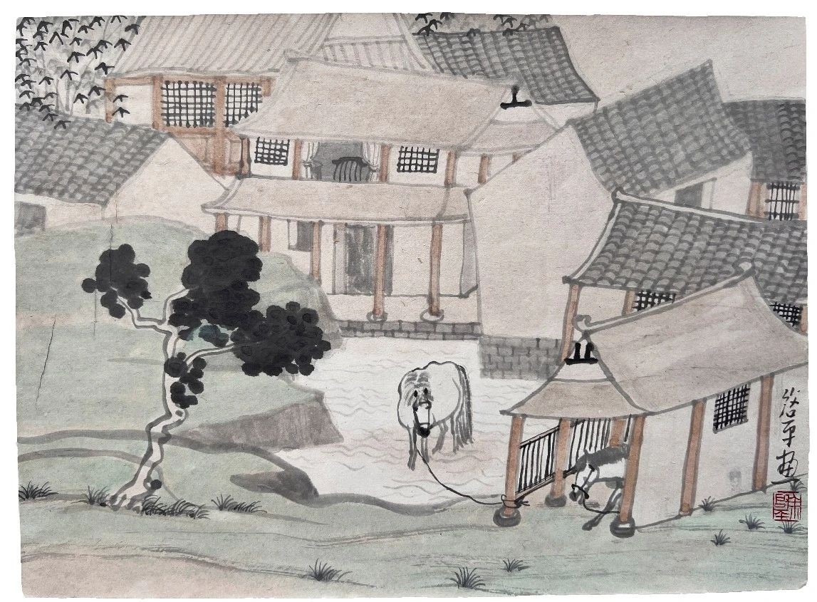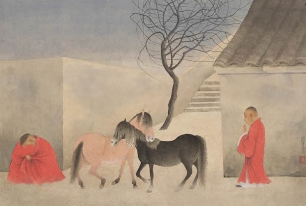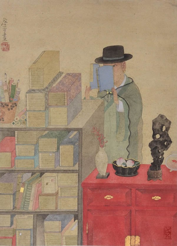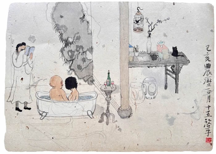 余启平本人的风格化并不太明显——但只要一交流就能感受到他的儒雅风是已深入骨髓。在很多艺术家、学者、文化人已经过于讲究传统“恬静、中式或洋气”的今天,余启平的儒雅风其实是颇具当代性的。所谓当代性,有一个特征即是“消解掉个人特质,呈现环境或事件中人物的处境,进而启发人思考”。在余启平的作品中,他很少让人物的面部表情直接出现(当然不是完全没有,而是相对较少),要么背对观众,要么侧面,要么有遮挡……这和中国传统绘画中对人物的处理方式有很大不同。于是就很自然地会让观众将注意力放在画面的场景和叙事叙情方面。至于这样的处理是否有意为之,我们并没有直接交流过,但我猜想这并不是他有意识在作品中打造这种机制,而是在下笔的时候有种本能驱动他形成了这样的“风格”。