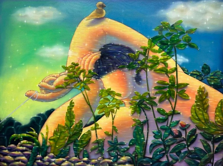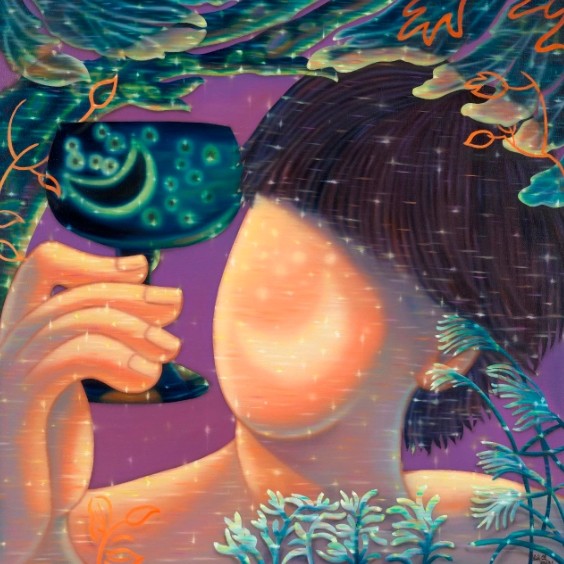 “光”是另一个王金博作品中不可或缺的元素。艺术家像是一个追光少年,他迷恋光,也很巧妙的通过对“光”的运用制造出氛围感和情绪感。在《长岛冰茶》中,有大片的暖光处理,像是落日的余晖,浪漫却又带着“夕阳无限好,只是近黄昏”的些许遗憾;在《暂停一分钟》中,黑夜里有一盏明亮的台灯,但很明显台灯的光亮不足以照亮画中TA的庞大身躯,此刻的光更像是梦里的光,自然光和人造光交相辉映;在《误入奇妙夜》中,双腿之暖光、手臂和脸庞的冷光、金银财宝的光亮、植物亮部的光以及天空的紫光等等,冷暖交替,魔幻迷醉,此时画中的夜晚比白天更为妙趣,正如作品的标题,一不小心“误入奇妙夜”;还有如《黑色月光》、《指挥家》、《麋鹿》等,冷暖光以及不同颜色光的运用,多元而迷幻,再加上画中的各种阴影的处理,让人在光影中体悟着人间的酸甜苦辣和五味杂陈……