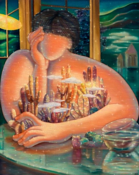 值得一提的是,“无脸人”的局部常常被绿草、树叶和灌木遮挡着或包裹着,“TA”有时也怀抱着自己或是其它事物,像是缺乏安全感。艺术家不希望给予人物明确的表情,却又通过肢体和神态隐隐的揭示出人物的情感特征和内心世界。在艺术家看来,在繁华都市生活的现代人虽然经历丰富,纸醉金迷,面带笑容,可是在内心深处往往是缺乏着归属感的,于是王金博就悄悄地通过画中的某种动作和神态—被怀抱或者拥抱其它——说明和回应了这点。