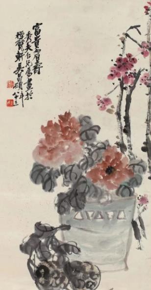 明清美术既具备了时代风貌的特征,又反映了中国美术从古代向近现代转型的整体趋势。到了19世纪晚期的中国画创作,则反映了中西融合的文化进程和以城市市民阶层为主体的审美新观念。本次展览就展出这一时期“海派”著名的画家吴昌硕的国画《富贵眉寿》,其实吴昌硕不仅在绘画上取得突出的成就,而在诗、书、印也无不精通。它的大写意花卉,将书法、篆刻的行笔、运刀、笔势融入绘画,形成富有金石味的独特画风,表现出“自然生趣”和艺术创作的时代感。