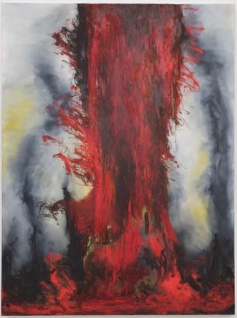 这些作品彰显了传统绘画形式和绘画历史中创造性能量的释放,由此,卡普尔勾勒出一种紧迫、迷茫和不安之感。它们是向绘画史的真诚致敬,但艺术家并不拘泥于过去,他既在画作中直接地引用特定主题,却也拒绝落入俗套,拔新领异地开辟了独树一帜的视觉语言。卡普尔近期的作品蕴含着一股冲劲,它们不是对他整体艺术实践的背离,而是十分重要的一部分。换而言之,这些作品是他毕生艺术实践的缩影:它不是单一的作品系列,它象征着创作的本质,其中结合了艺术家诸多长期的思考和联想,升华了在工作室里的日常以及艺术创作的意义,并且拓展了他作品中常见的“身体”的主题。如果真如安尼施本人所言,作品很纯粹地就是创作本身,它们并未被赋予来自艺术家的过多叙述,那么观者在欣赏时可以不把他的作品当作是某种陈述,而是潮起潮落的脉冲、涌动的流体物质,如同在身体流淌的血液,在山川蜿蜒的河流。作品的涓涓细流承载着碎片和残余物、生命的胚胎与雏形,时而被浪潮淹没,时而浮现在表面。这条艺术支流以一种史诗般的表达,诉说着万物、万物之肉身、肉身之思绪、思绪之文化,层层叠叠。它拓展了在蜡质和 PVC 装置中探讨的与身体相关的主题,这一点也丰满了卡普尔创作的维度和分类。从早期的颜料到孔隙,再到镜面和不锈钢系列等等,这些作品虽然艺术形式各异,但其中不变的是它们对思想、物质和空间之间不断变化的相互作用的创新性呈现方式。
