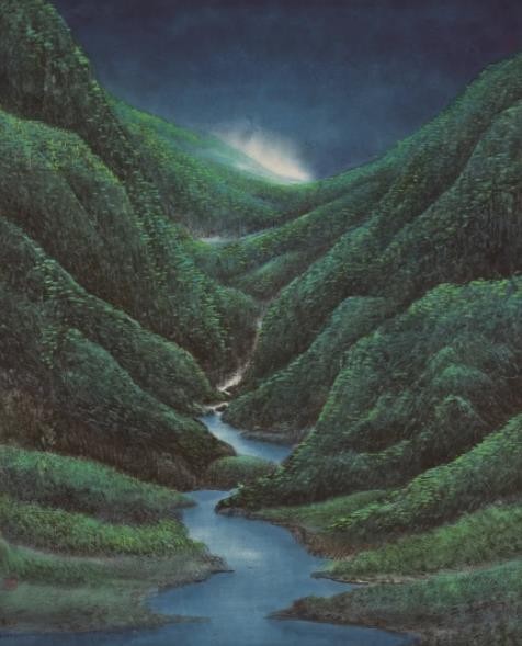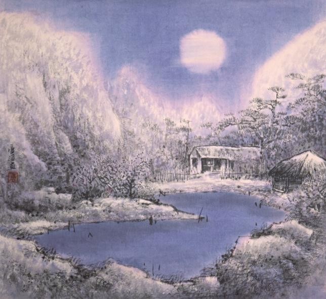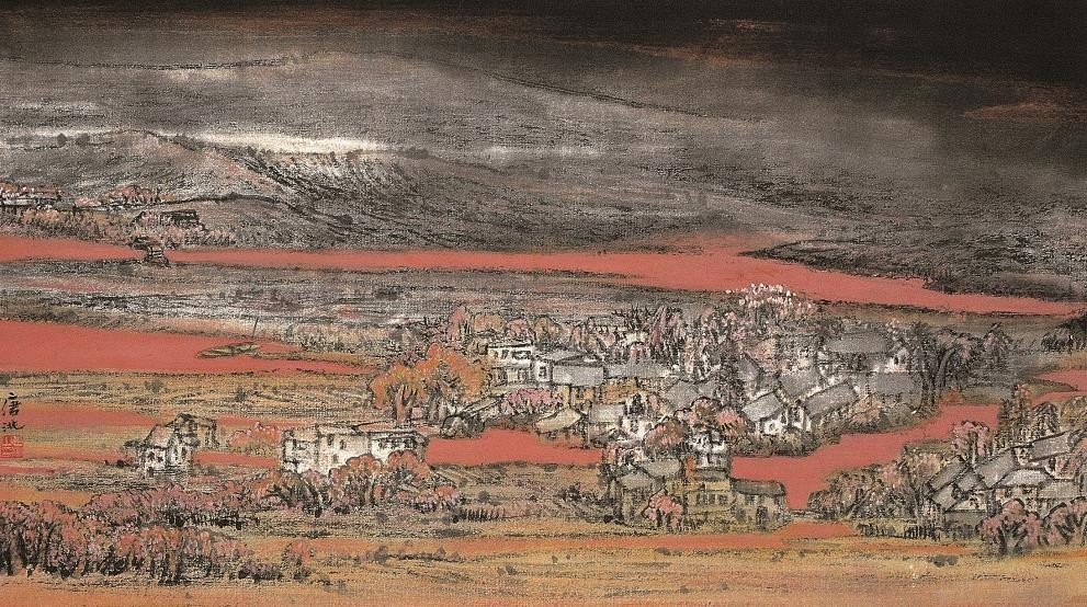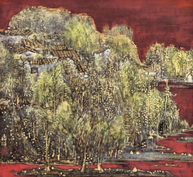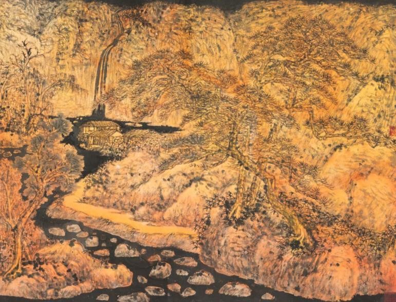 唐滔对中国山水画的贡献是被严重忽视和低估的!宋之后中国山水画以水墨为主,青绿山水为辅,丰富自然的色彩,留在了花鸟画中,基本退出了山水画,只是在墨分五色的表现系统中伸展延拓。翻开中国山水画的历史图册,像唐滔作品这样色泽丰富、自然又直抵人心的山水画是少见的,缺少图本的。唐滔丰富了中国山水画的色彩系统,与油画人为的色配不同,中国画的色彩以水溶为特征,自然,远近看皆统一,呈现在图本上的色泽,又是他心灵感知的色彩,为天人合一状态,自然而然且合乎于心。这既归功于他把各种染法接嫁于山水画,更在于他用色的选择为心性之色,使我们在图本上看上去既是自然的又是本然的,呈现出心性天然的色泽效果。而这系列丰盈的色泽,正暗合了唐滔个人热爱生活热爱生命抒情的诗性本质。