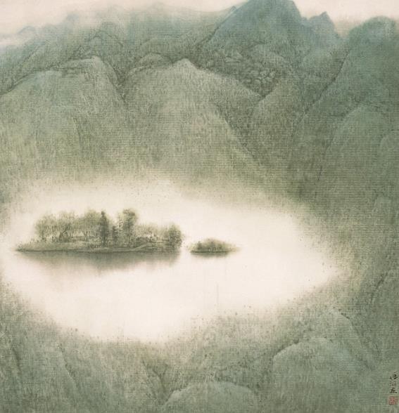 唐滔山水画的另一特征,就是将传统绘画中点苔之法发挥到极致,由法术的点上升到本质构成的点。尤其在晚岁创作的作品,我们看巜月出东方》,整幅作品,点苔近万笔,但你感到不能多一笔,也不能少一笔,使山川苍郁浑然,秀润于骨。点苔是中国山水画传统的技法,从雨点皴、豆瓣皴、米点皴化出,明唐志契云:“画不点苔,山无生气。昔人谓苔痕为美人簪花,信不可缺者。又谓画山容易点苔难,此何得轻言之。”近代画家黄宾虹认为:“山水打点,似人物画点睛。点非微不足道,点之得当,山水精神倍增。"唐滔深受石涛的影响,把点苔之法由状物到表现,提升到构成的状态,他深谙和热爱的江南山水,似乎由这春雨之点构成,使山川充满韵味和灵响,雄秀浑然,天地精神。我们在唐滔与张巾英的通信中感知,他是一个多么热爱春色和春雨的画家!春雨的温润和饱满似乎就是他发展雨点皴和点苔法的內在动因!以上两点是唐滔对中国传统山水画的主要突破与贡献。
