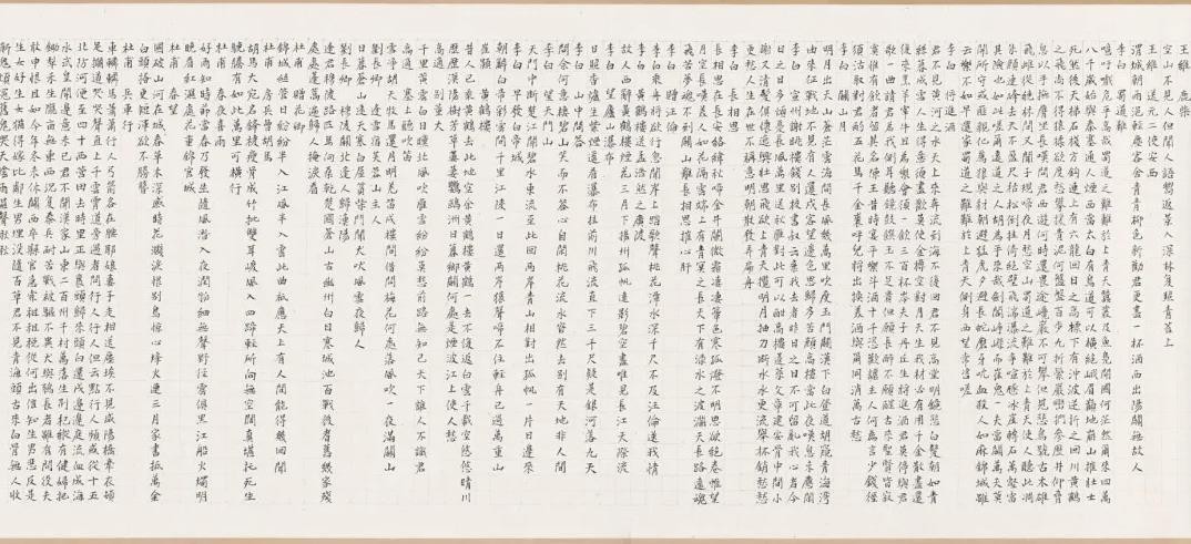 由国务院参事室、中央文史研究馆、中国美术家协会、北京美术家协会、北京画院主办的“意飘诗外——王明明古诗意画百开册页展”将于2022年4月29日至5月14日在北京画院美术馆展出,展览汇集了王明明所创作的古诗意册页共一百幅,其创作时间自2006年至2019年历时十三年之久。册页是中国画特有的表现形式,可集诗书画于一体,往往在统一的主题下由画家于盈尺间将多张独幅画作组合而成,与卷轴和手卷相比更便于翻阅和收藏,是文人墨客案头赏玩书画的一种艺术形式。王明明近十米长的唐诗宋词三百首小楷手卷也同时展出。