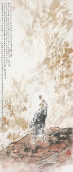 中国自古诗画相通,苏轼在《书摩诘〈蓝田烟雨图〉》中评价王维的作品:“味摩诘之诗,诗中有画;观摩诘之画,画中有诗。”中国艺术中的意境是虚实相生,是情景交融,宗白华谈意境:“化实景为虚景,创形象为象征,使人类最高的心灵具体化、肉身化,这就是艺术境界,艺术境界主于美。”中国传统的诗与画,就是这种经诗人和画家内化的精神性的产物。在王明明从“神童”到职业画家的六十余年创作生涯中,亲历了二十世纪中国画变革创新的过程。但他始终认为中国画有其独特的基因、表达方式和艺术规律,他期望通过自身的探索和研究寻找中国画形而上的美学规律和传统的本源。他以诗入画,深研诗的历史背景与内涵,择诗之意境,与个人经历与情感相结合,在中国广漠的时空之中,与古人对话,把今人的画家之心融入到古人的诗境之中。