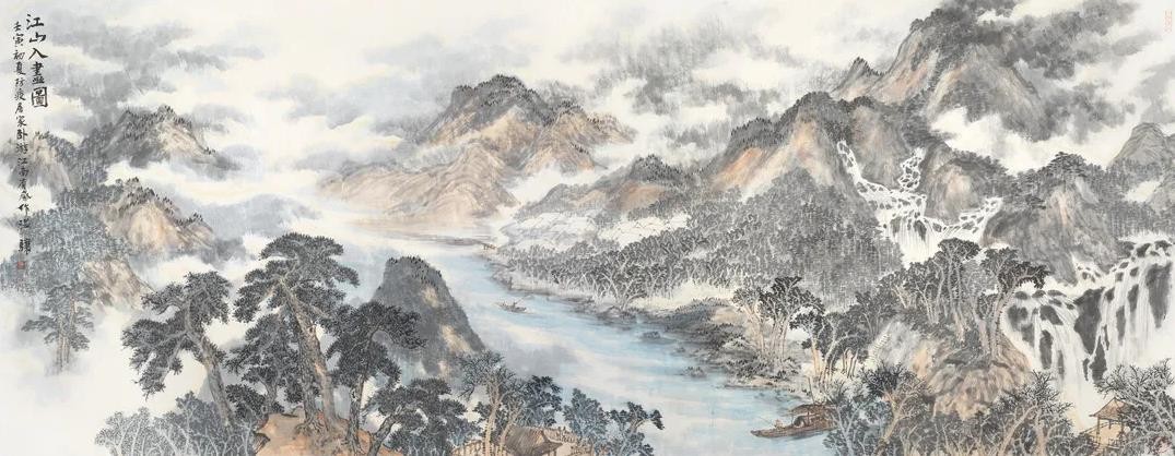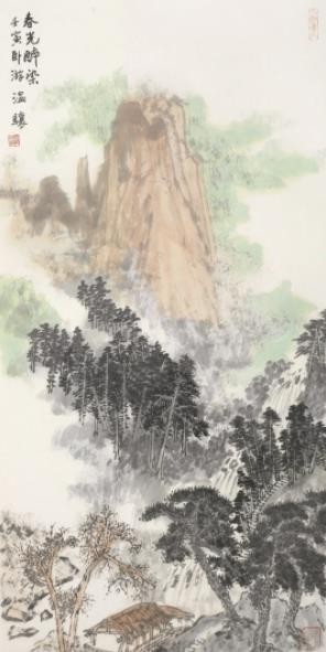 温骧君去年刚刚在中国美术馆举办过个展。近日,又在北京画院展出了一批新作。这些新作大多是江南之行的纪念,他说是“卧游”,实际上是与江南美景的对话。他的画风也因“忆江南”的意味,仿佛由写实发生了向写意的转化,明显地放开了大笔,放纵了淡墨,甚至于为表现云烟变幻的气韵也放大了空白,古人说:“云为诗留”,这云便是他心中的诗。他有感于江南处处青山绿水,还画了不少青绿山水,多用微妙的一抹淡绿将那“春光醉染”,那淡绿被淡墨映衬得嫩雅之极,他说是“春把山河图尽”。他也偶尔用青色,在《江山无尽意》巨幛中,以石青衬着石绿,青益青,绿益雅,令人想到辛弃疾的那首《贺新郎》词,该词上阙曰:“甚矣吾衰矣。怅平生,交游零落,只今余几。白发空垂三千丈,一笑人间万事。问何物,能令公喜。我见青山多妩媚,料青山、见我应如是。”温骧也古稀之年了,但他不衰,交游颇广。白发无几,游山不辍,因疫情宅家,卧游不倦,遂念江南青山绿水,与之对歌也。他见青山妩媚,而青山怎么可能“见我应如是”呢?诗人,画家往往将青山视为友人,视为君子,与之对话,与之交心,温骧笔下的青山便如是。这就是中国山水,中国哲学,中国的天人关系。
