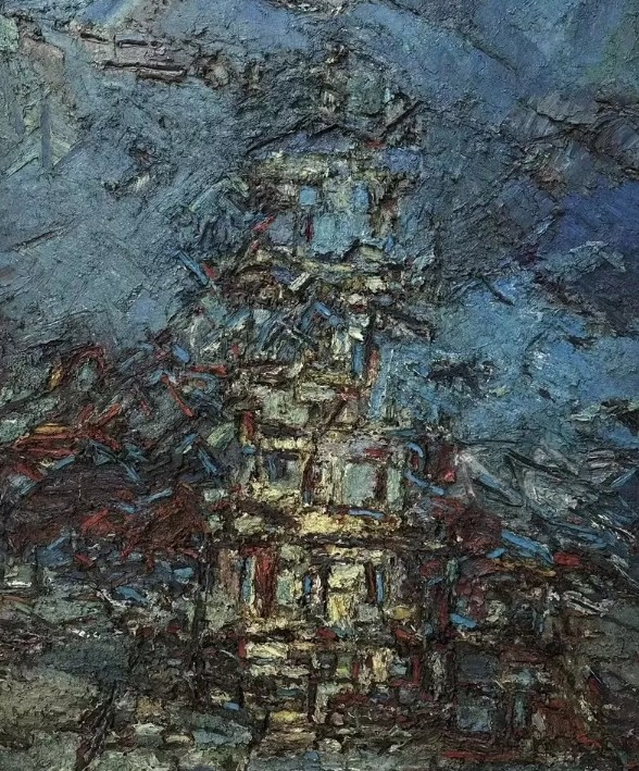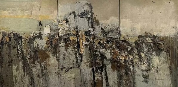 不知从何时起,付智明的创作就演变为一种以厚重颜料堆叠为主导的视觉形态。层层肌理交错斑驳,宛如疾风骤雨,又似岩浆奔涌,让人仿佛感到大地在轰鸣、城垣在摇曳。在其如刀劈斧斫般的画面中,有影影绰绰的城墟和碑塔,也有蔓延集簇的原野和山石,共同凝结为一片苍茫浑厚的天地气象。