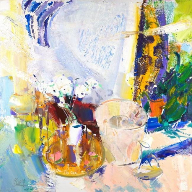 这,正是举办本次展览的意义。两位画家在艺术创作上一中一西,却彼此呼应,正如西方油画与中国大写意之间的微妙联系。张宜生于1969年,管朴学生于1968年;两人都是土生土长的潍坊人,管朴学是齐相管仲之后,张宜是潍县“四大家族”张氏之后,号为“齐人阿一”;张宜画风霸悍,却心思细腻,“心有猛虎,细嗅蔷薇”是他的风格写照;管朴学画风柔美,但她写生时豪气满怀,大刀阔斧,那股劲儿,有一种山东爷们女汉子的范儿;两人在艺术创作中都富于冒险精神,张宜从来不认为一张“没毛病”的画就是好画;管朴学宁可选择画“坏画”,也努力争取达到新的高度;张宜的《阿一心灯》与管朴学的《寂》,俨然是彼此的精神镜像……总之,张宜就是男版的管朴学,管朴学就是女版的张宜。