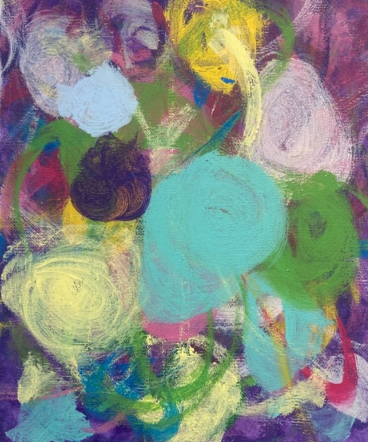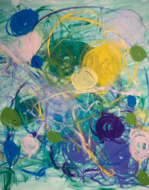 她的绘画充分调动联觉性的身体感知,视觉形式在其中成为跨感官知觉的综合载体。纯粹、迷人的内在音乐性被定格在二维画面上,原本依托于线性流动的时间的听觉艺术,凝固成了空间的艺术。她笔下的色彩如同五线谱上跳跃的音符,或高亢清亮或低沉顿挫,都在回应着勋伯格的“不和谐音的解放”。无论融洽还是冲突,她任由潜意识中的激情流动,并将之视为平等的调性予以充分表达。画面的单一焦点与构图法则被打破,随机的偶然与必然则互相博弈,不断变奏,进而演绎出螺旋上升的无调性旋律。