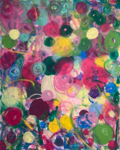 画面中,我们仍能见到锦簇的色彩涌动——自然与植物的原初样貌,仿佛是对春日韶华的隐喻,也是蓬勃的生命意识在画布上的诗意留痕。天地万物的生长秩序与烂漫精神,从种种原型中脱胎,再升华成点、线、面的理式,呈现出一种愉悦的动感。