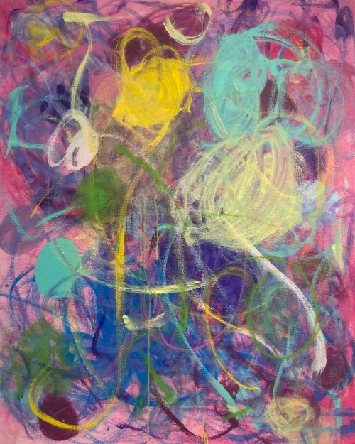 如果说康定斯基表述其抽象为“线条是点在散步”,张轩绮的抽象则是“点与线在平面上的圆舞”。在这支热烈的狂欢曲中,色块时而聚拢,时而纵情旋转着散开,彼此触摸、搅动、交织,却不逾矩。