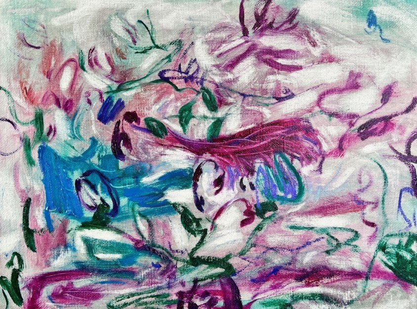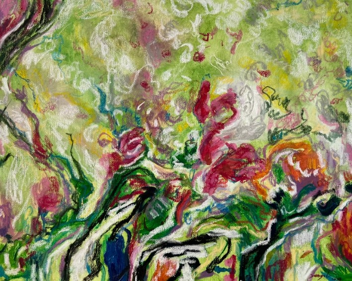 我的作品是一个寻找现象背后隐藏之美的过程,敏锐的感受一切,接纳一切,感受一切是创作的源泉。色彩以直接和感性的方式相互融合协调,运动的笔触交织缠绕,让画面拥有微妙的能量,以意象融入其中。