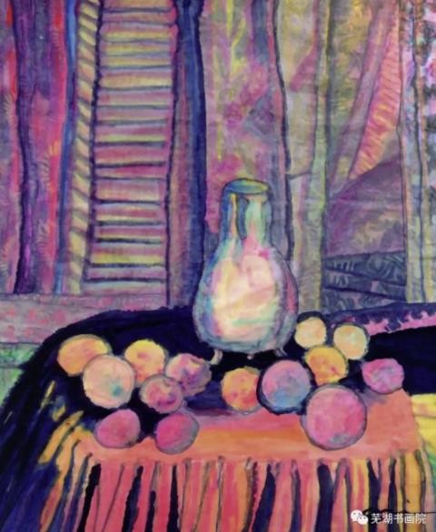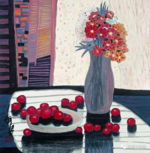 杨佴旻的创作可以说是继续了林风眠、吴冠中探索之路的一种融合中西技法的新型写意水墨画。我以为,对传统笔墨即对勾、勒、染法的自由运用,是杨佴旻不同于林风眠、吴冠中彩墨画的地方。林、吴的作品,整体上有中国文化精神,造型也颇有气度,但线和造型手段采用西法较多。杨佴旻有很好的色彩修养,他侧重于用调和色,少用鲜明的对比色,色调温文尔雅,颇有东方艺术神韵。