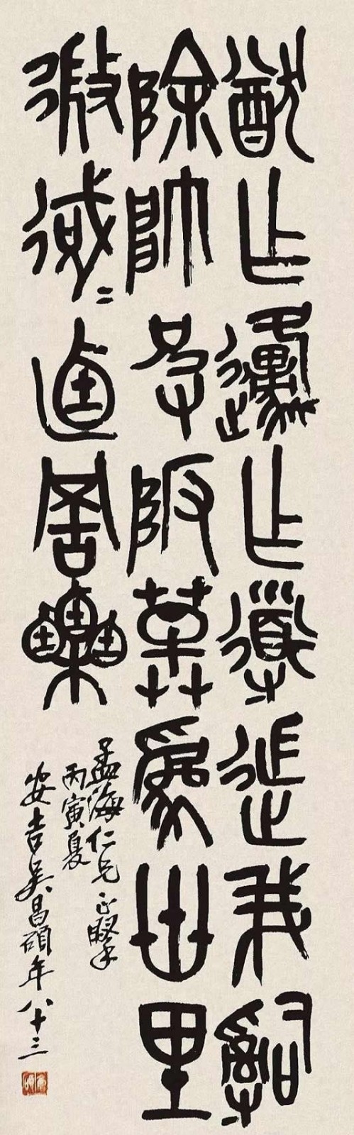 此外,吴昌硕也是一名篆刻家,刻印以钝刀出锋,章法森严,用刀大胆,字口工整细致,字型多姿。他对《石鼓文》的深入研究,为书画创作的开拓创新奠定基础,使画作和书法具有圆厚古拙的气息。