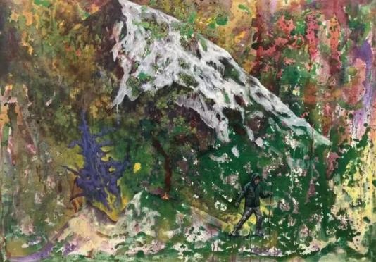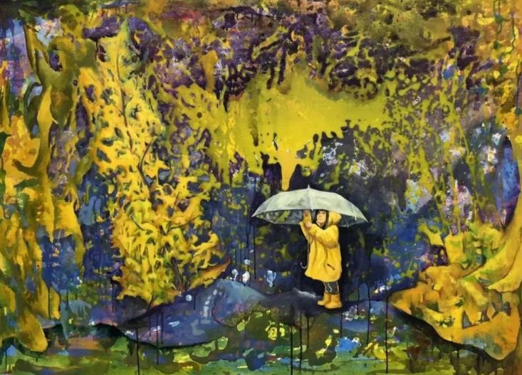不论是《林雨》中独自撑伞的人,还是《自由寻觅》中绿意盎然幽深的山间,哪怕在表现力如此的强的山中,其中的小小的人儿仍难以忽视,仿佛是他们的身影激活了这些风景,也使画面充满故事、更具深意。