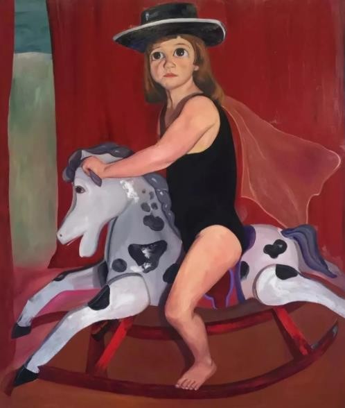 如2015年创作的《骑木马的女孩》,画中的小女孩身披轻纱,骑着木马,直率又带着一丝疑惑的大眼虽是向上看,但又漫不经心的闯入人们的心中。
