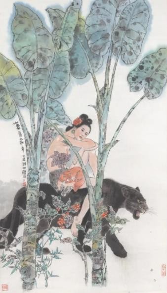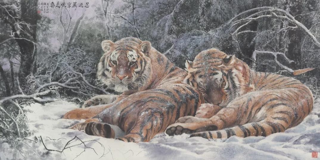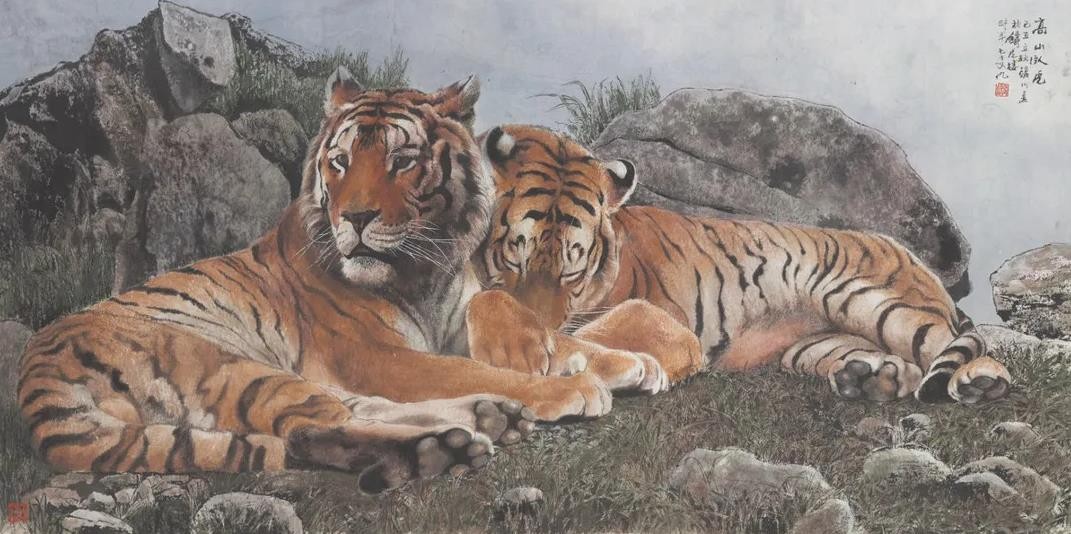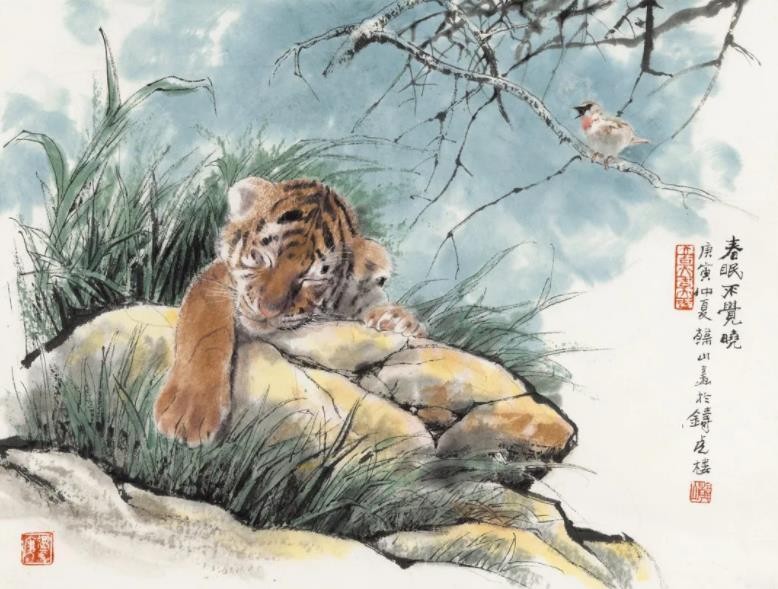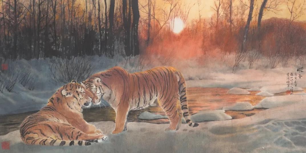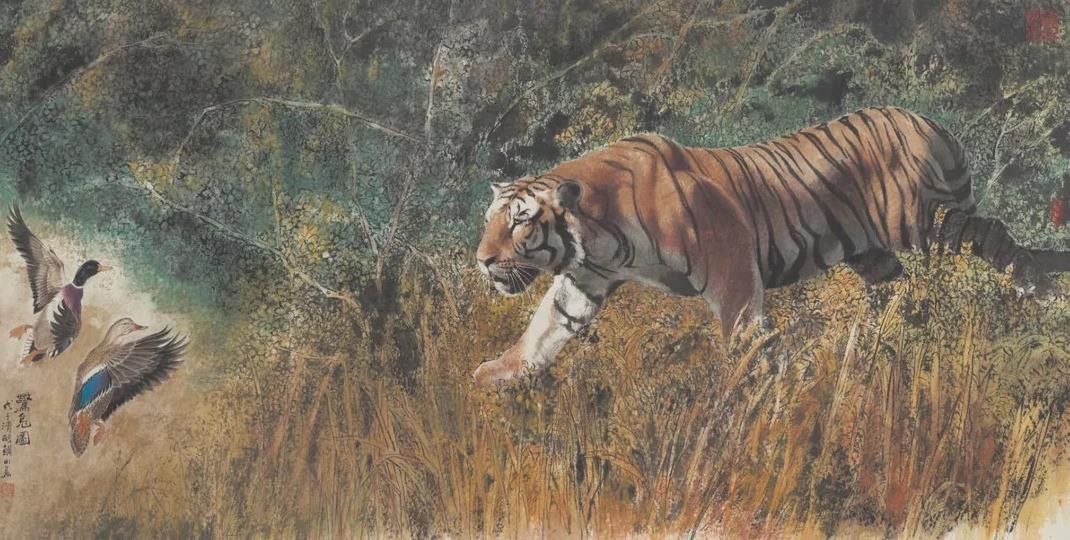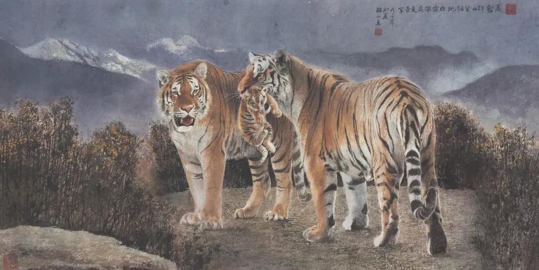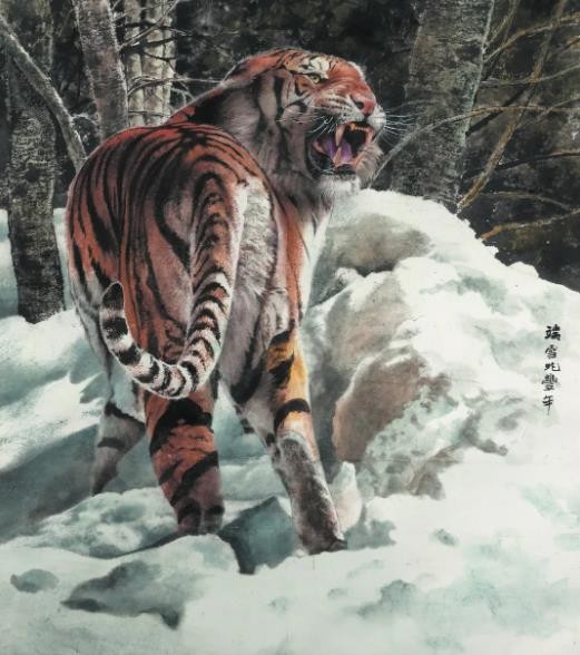 韩山画虎突破国画常规,以动物园老虎为师,苏州正好是华南虎繁殖基地。为了画出逼真的老虎,他经常“深入虎穴”,常常在动物园和华南虎繁殖基地一待就好几天,用速写、观察、摄影来捕捉老虎日常活动中的一举一动情景。功夫不负有心人,他收集了老虎的坐、卧、跑、跳、走、望、舔毛、嬉戏、睡觉、捕猎、回眸相呼、掀风狂啸姿态动作等喜、怒、哀、乐大量素材,熟记于心,在画虎时“胸有成虎,呼之欲出”了。