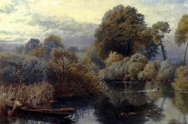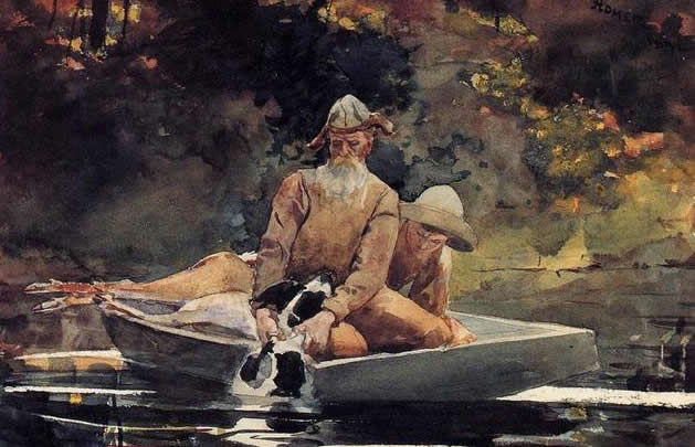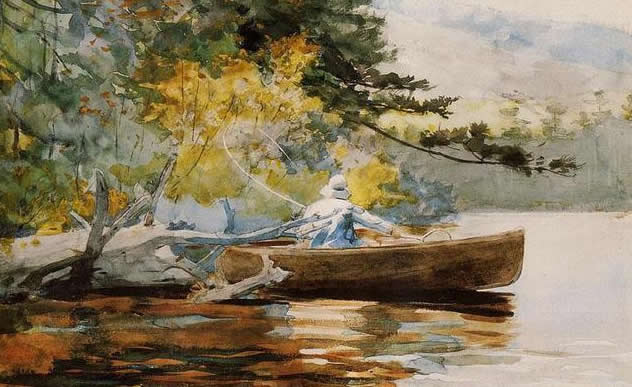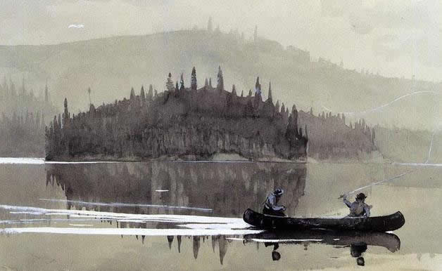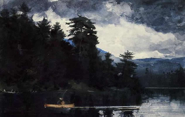 温斯洛.厚莫(1836-1910)(美国)每一幅好的作品都有一个合适的色调,但有时画家会特别强调色调。该画就是以色调取胜——浅紫灰偏黄色调。首先,画面层次分明:远山、天空及它们的倒影为浅色调;中间的山丘及倒影为灰色调;前面小船为黑色调。而水...