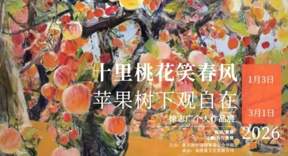 北京意大利中国理事基金会学院艺术馆正在举办艺术家徐志广的最新个展“十里桃花笑春风·苹果树下观自在”,将持续至2026年3月1日。此次展览由冯骄策划,展出了艺术家近年来以苹果树和桃花源系列为主题的创作与实践,涵盖了40余件布面油画与纸本水彩、水墨作品,以及20余件釉下彩瓷器作品。作品全面呈现出这位当代艺术家的独特视野和极具辨识度的艺术语言。