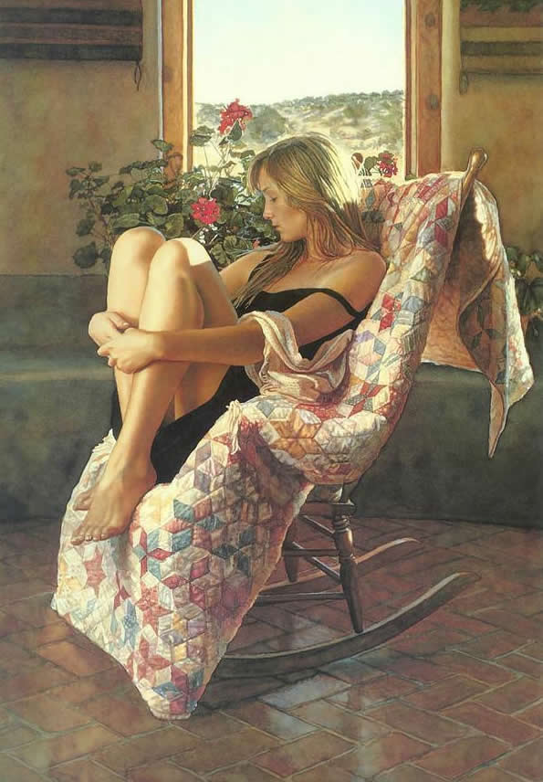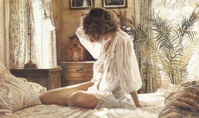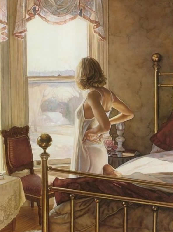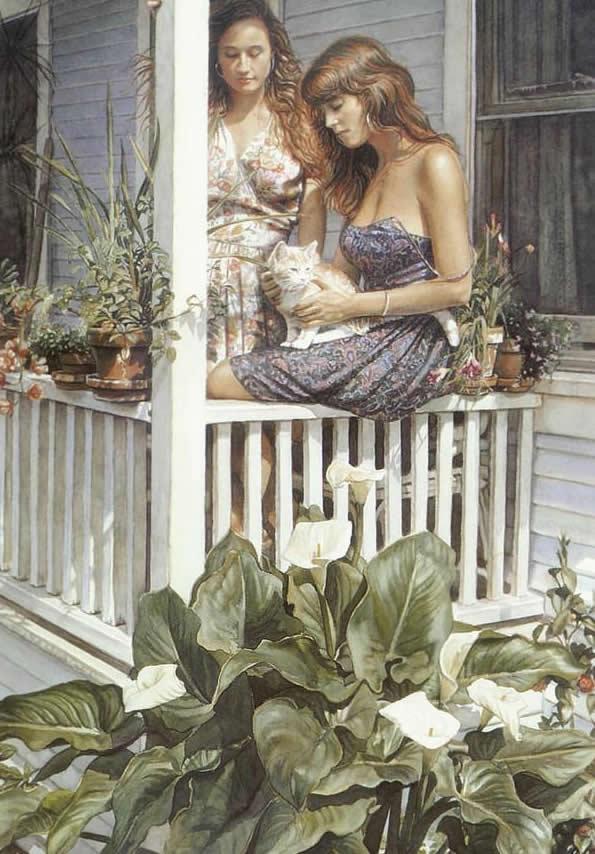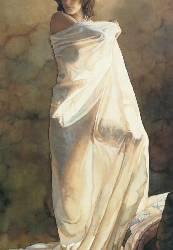 天色渐晚,祖孙二人收拾鱼具准备返航。画家重点刻画老人面部——沉稳中隐着一丝紧张。爱孙从背后探过头来,忐忐的、是新手。背景丛林做虚的处理;而近处的水面,通过色彩变化和笔触的运用,很好地表现出水的质感。从整个色调看,似与上一幅有些雷同,而我们绝无雷同之感。为什么?归根到底,是画家的水平起作用。那些用颜色画素描的水彩画,从本质讲,都是雷同的,因为它根本没有色彩。而色彩高手,绝不会与“雷同”联姻。